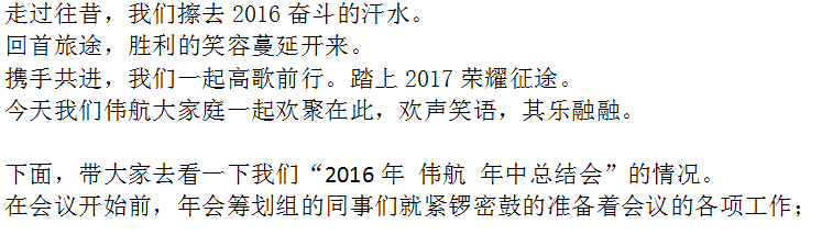 公司于2019年2月1日在雅安 周公山楠水閣溫泉酒店舉辦了“偉航2018年年會(huì)”,偉航人用聰明智慧,無(wú)限才藝,使得年會(huì)圓滿(mǎn)落幕,18年是偉航成立十周年,有偉航人的汗水與歡樂(lè),19年是偉航新十年征程,我們?cè)俪霭l(fā)!發(fā)布時(shí)間:2016-12-26